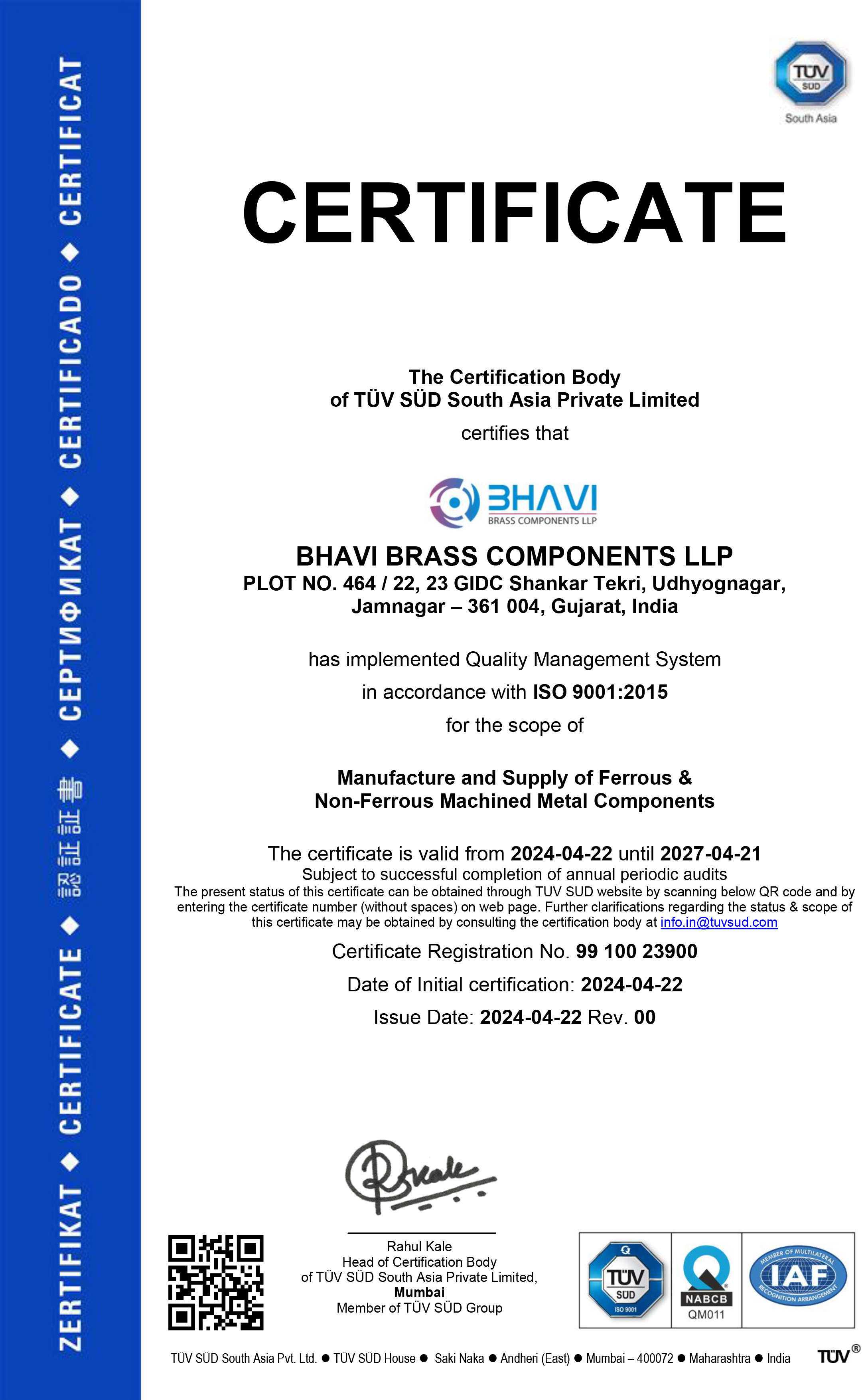 At Bhavi Brass Components LLP, we pride ourselves on our robust quality management system. Our dedication to excellence is reflected in our certifications and meticulous record-keeping practices.